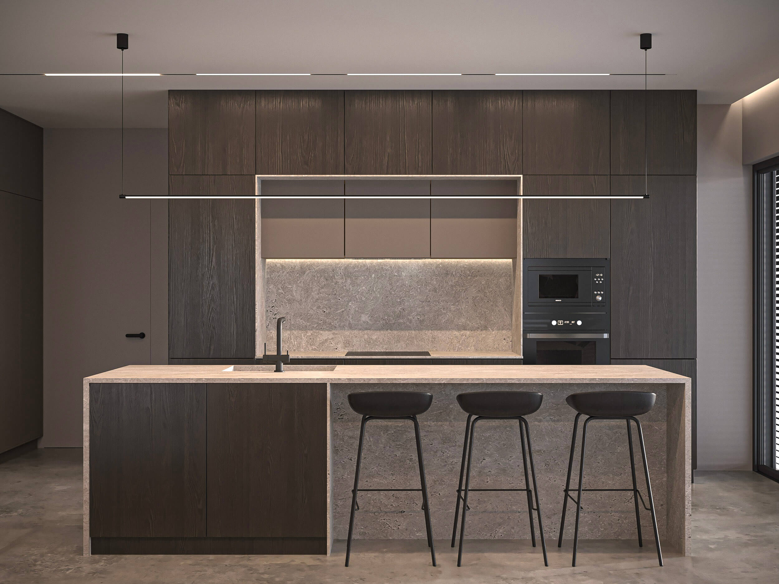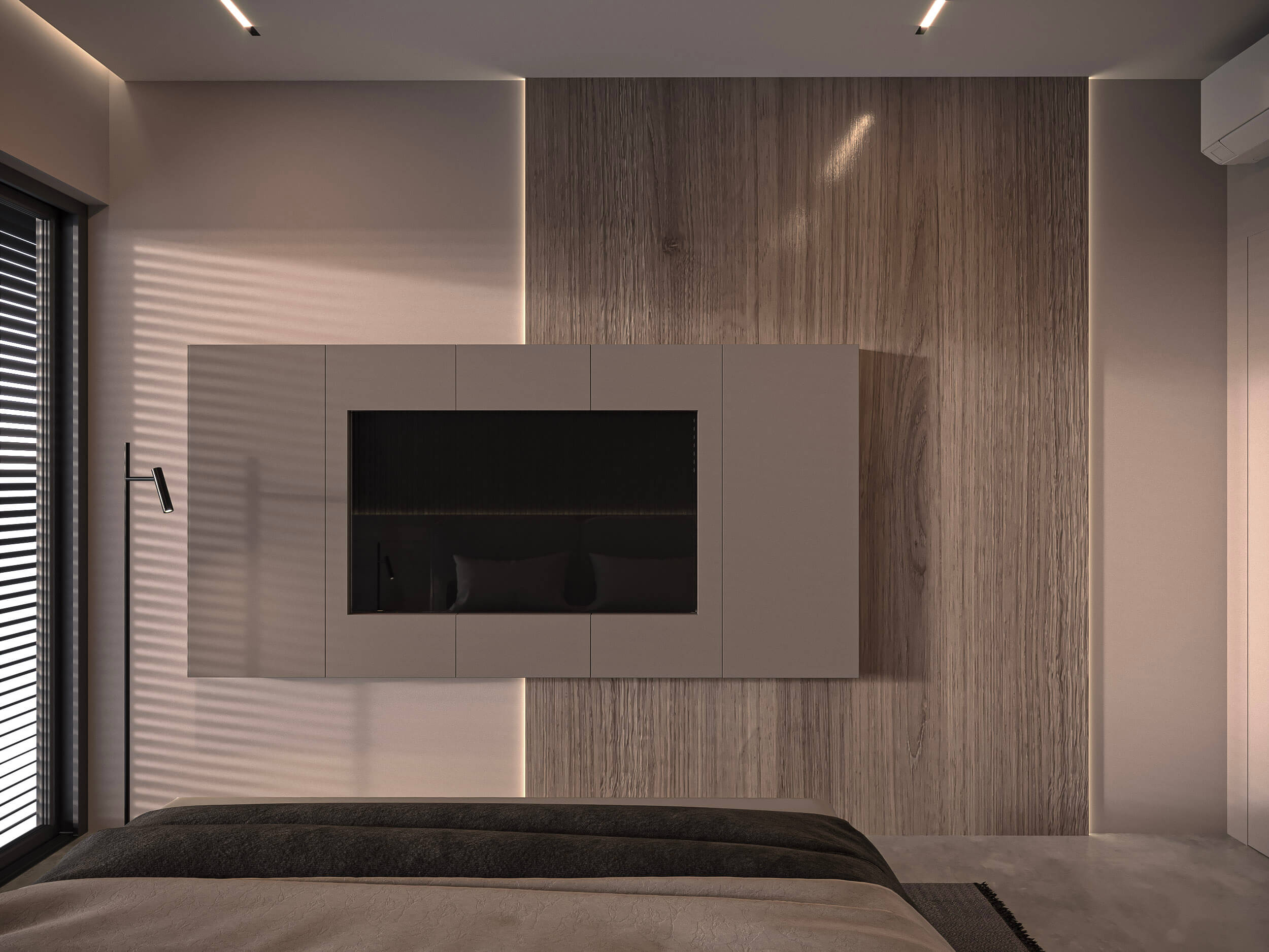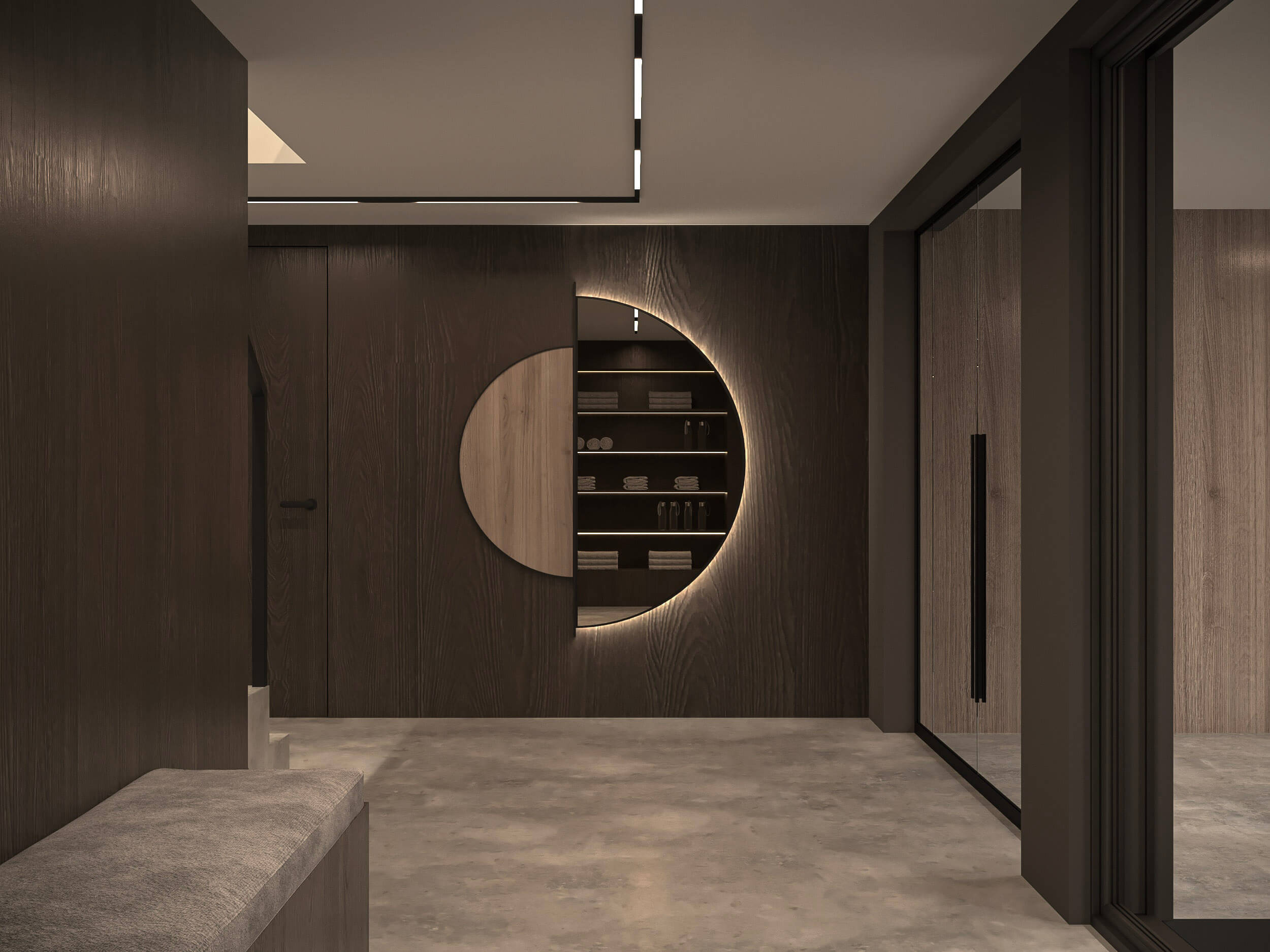 To wnętrze otula ciepłem niczym najdelikatniejsza, aksamitna czekolada. Dominują tu głębokie odcienie brązu, karmelu i mokki, które tworzą atmosferę elegancji, spokoju i wyrafinowanego komfortu. Naturalne drewno buduje elegancką strukturę, a subtelne podświetlenie podkreśla jego fakturę, dodając przestrzeni miękkiego, nastrojowego blasku. Całość utrzymana jest w duchu spokojnego minimalizmu, w którym każdy element ma swoje miejsce i funkcję.