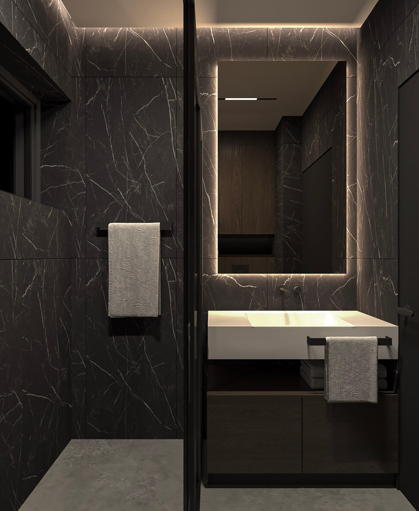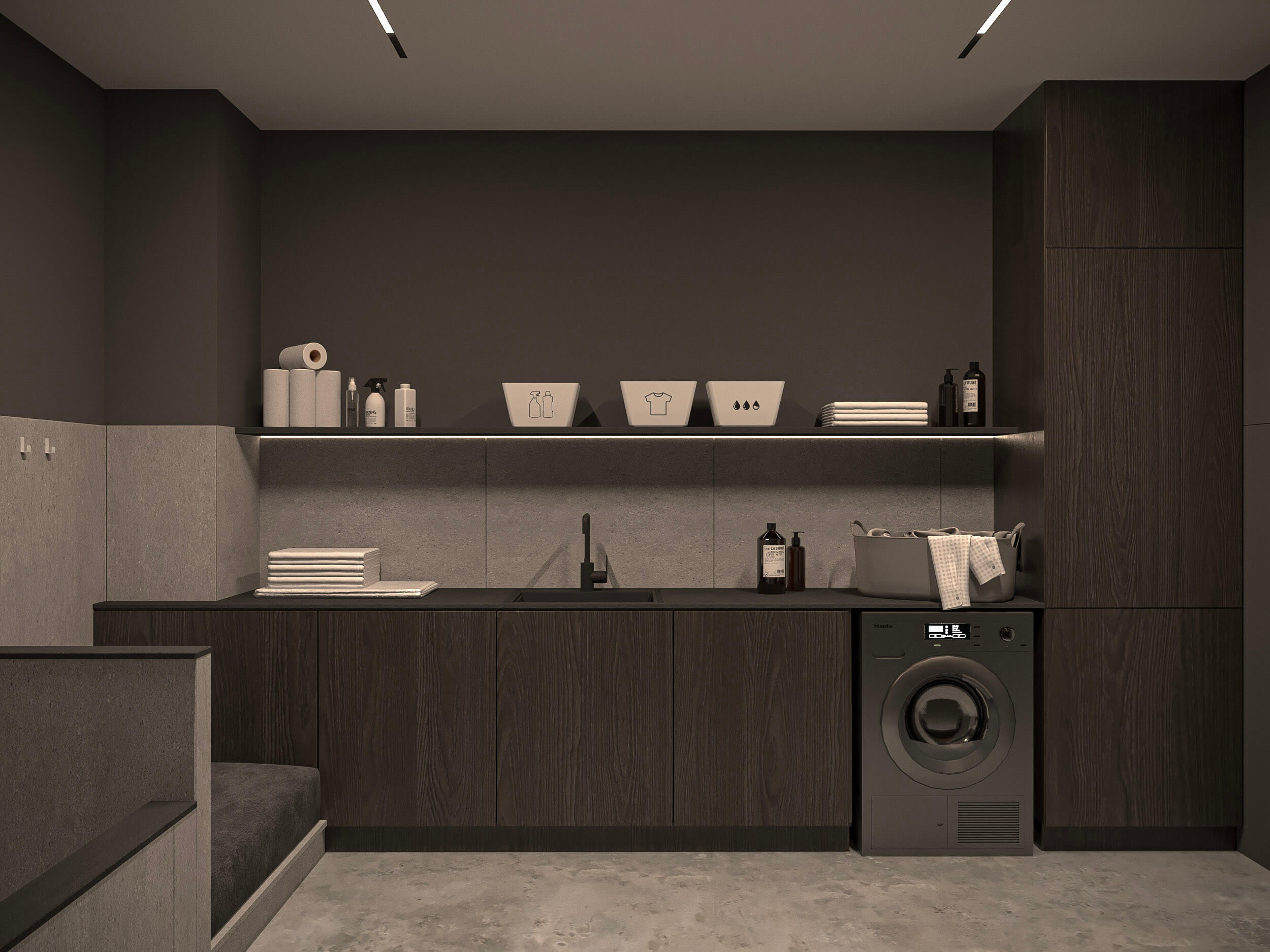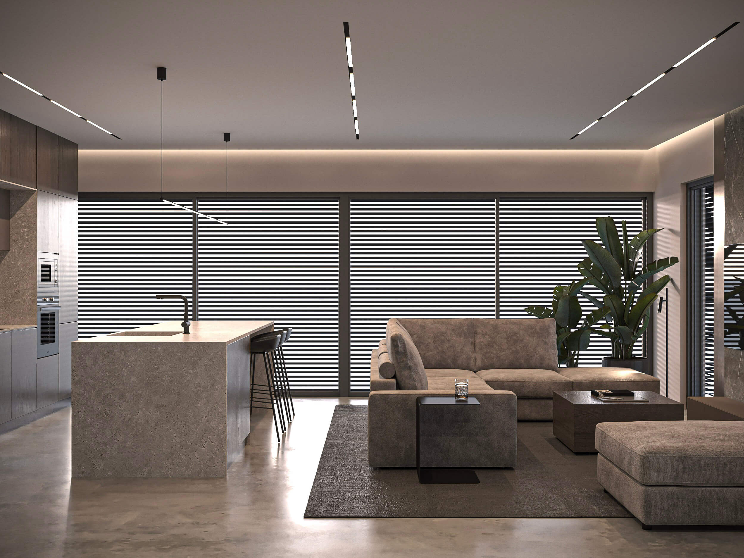 To wnętrze otula ciepłem niczym najdelikatniejsza, aksamitna czekolada. Dominują tu głębokie odcienie brązu, karmelu i mokki, które tworzą atmosferę elegancji, spokoju i wyrafinowanego komfortu. Naturalne drewno buduje elegancką strukturę, a subtelne podświetlenie podkreśla jego fakturę, dodając przestrzeni miękkiego, nastrojowego blasku. Całość utrzymana jest w duchu spokojnego minimalizmu, w którym każdy element ma swoje miejsce i funkcję.
