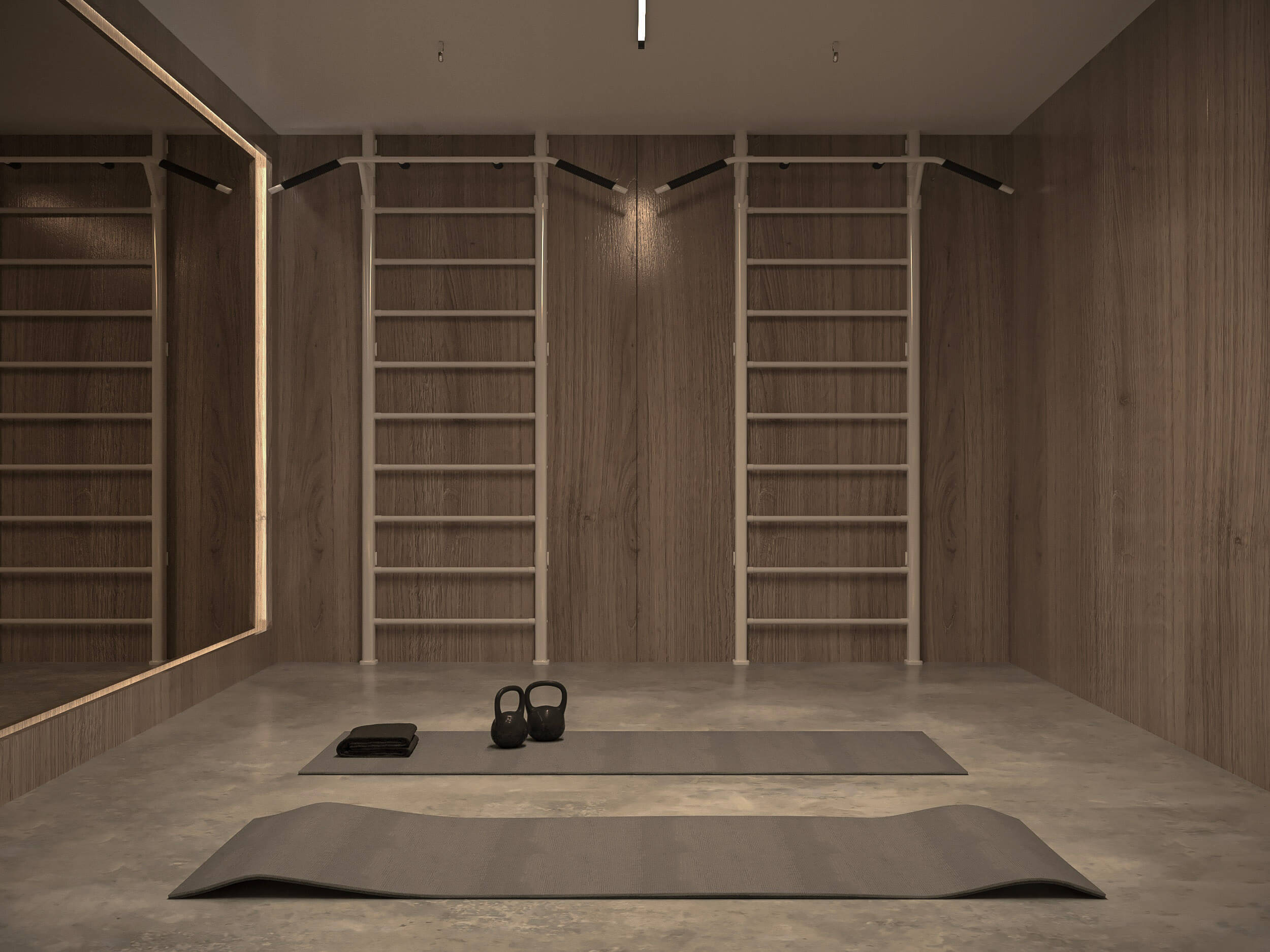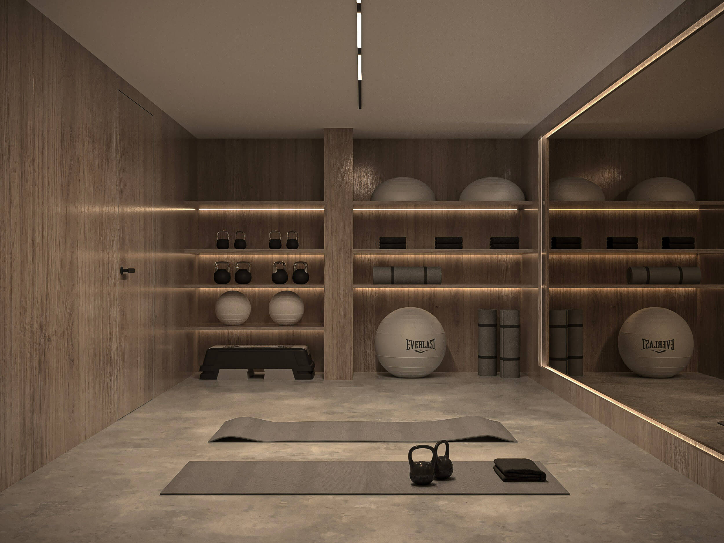 Ten dom zdecydowanie wyróżnia strefa treningowa. Ciepłe drewniane zabudowy z podświetlanymi półkami eksponują sprzęt sportowy niczym ekskluzywne akcesoria. Lustra powiększają przestrzeń i odbijają miękkie światło, potęgując wrażenie głębi i luksusu. Maty oraz akcesoria fitness wpisują się w uporządkowaną, niemal galeryjnąkompozycję.