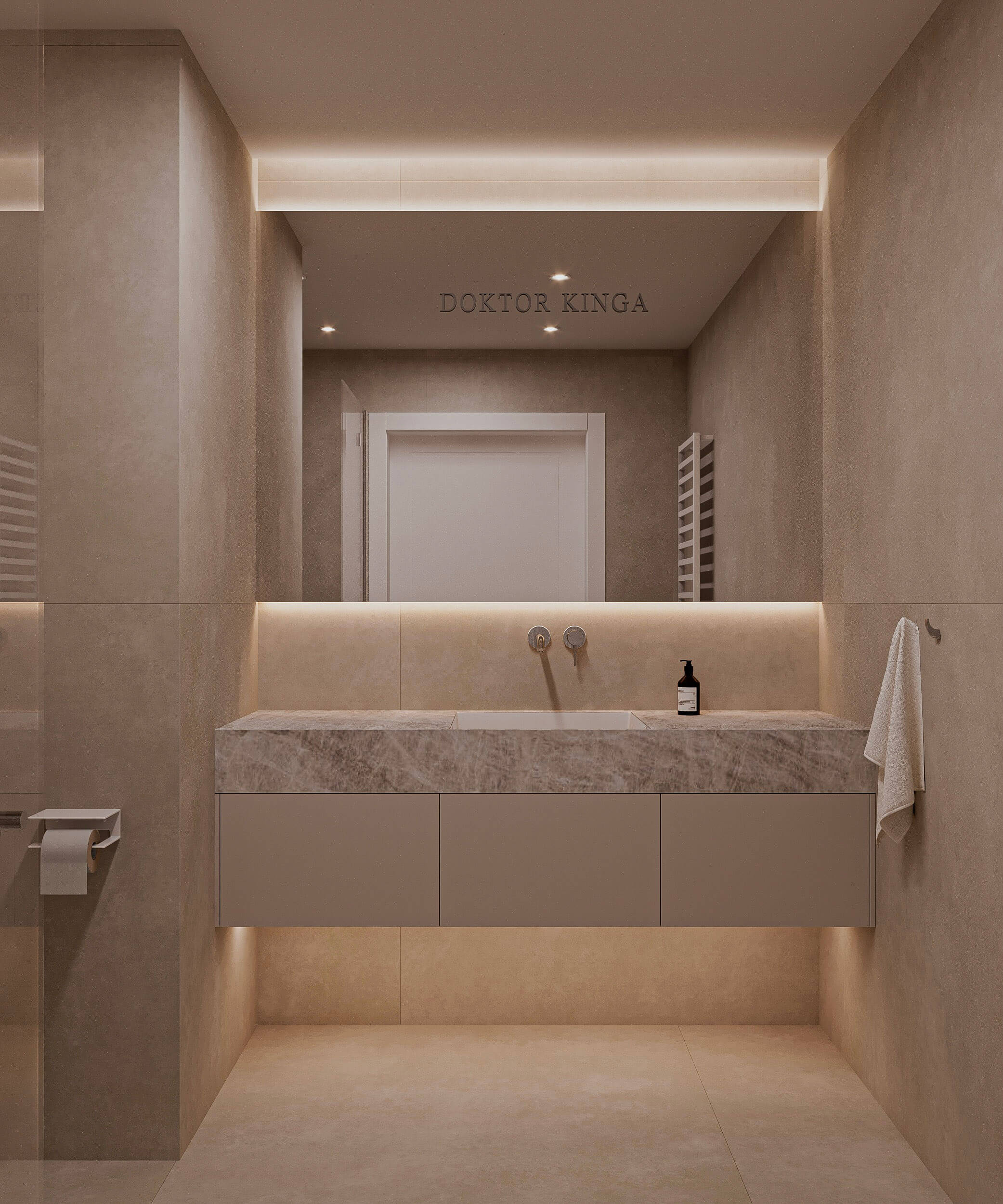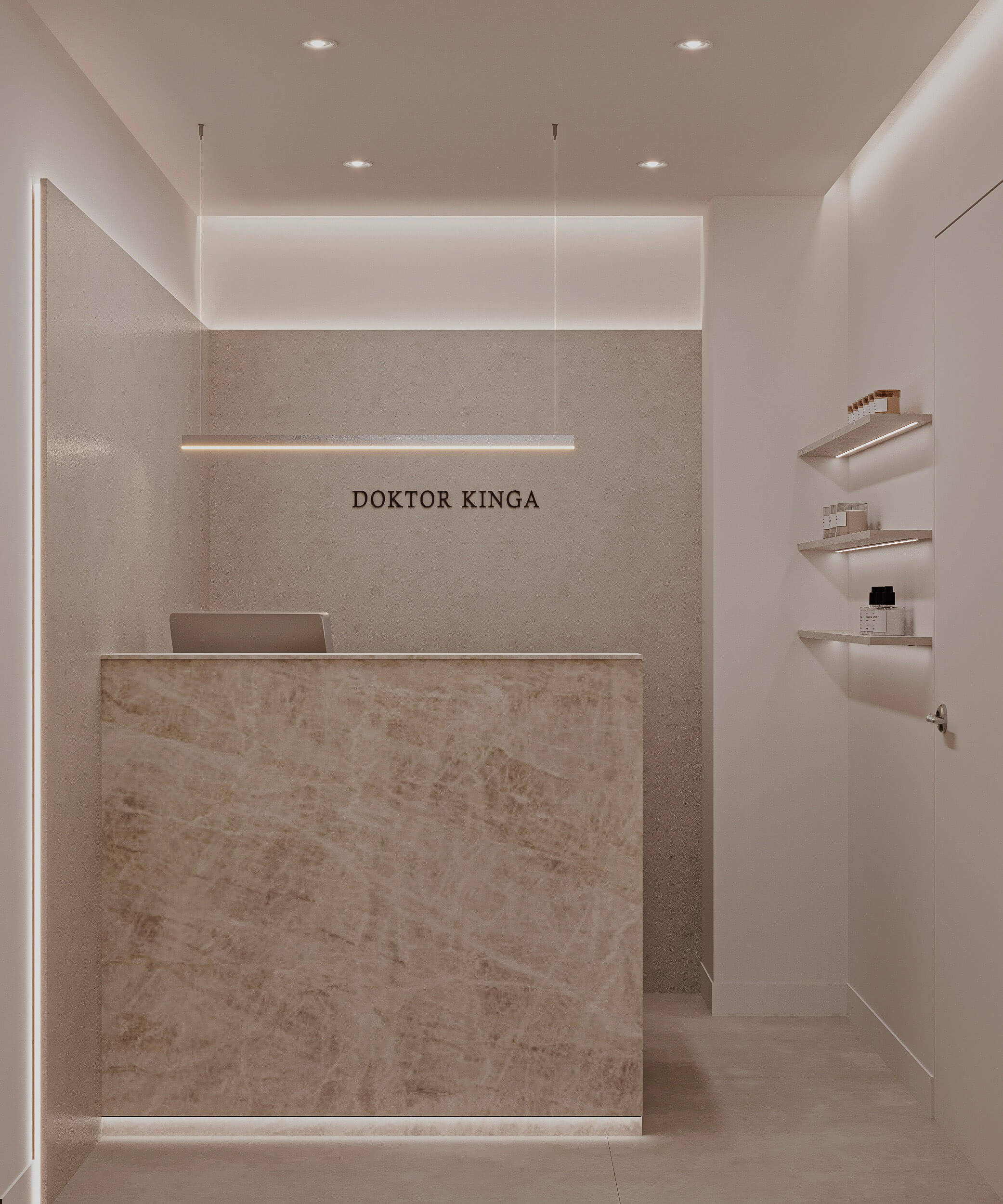 Wnętrze tego gabinetu to przestrzeń zaprojektowana z myślą o najwyższych standardach medycyny estetycznej, gdzie zaawansowana technologia spotyka się z subtelną elegancją. Monochromatyczna paleta barw, oparta na ciepłych odcieniach beżu i piaskowych teksturach, tworzy profesjonalne, a zarazem kojące tło dla precyzyjnych procedur zabiegowych. Architektura wnętrza świadomie rezygnuje ze zbędnych rozpraszaczy, stawiając na sterylną czystość formy i minimalistyczny design, co buduje poczucie bezpieczeństwa oraz zaufania niezbędne w relacji lekarza z pacjentem.