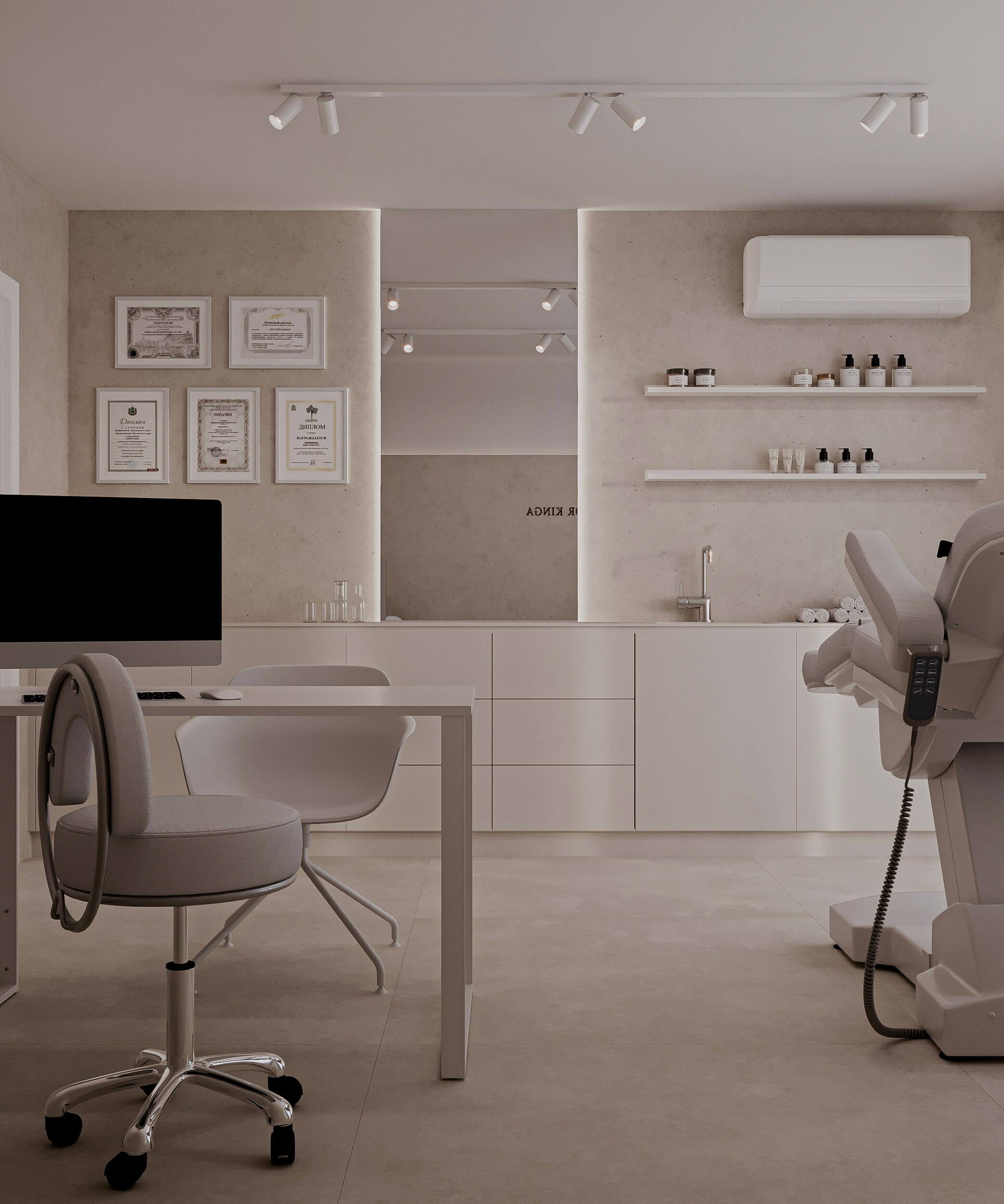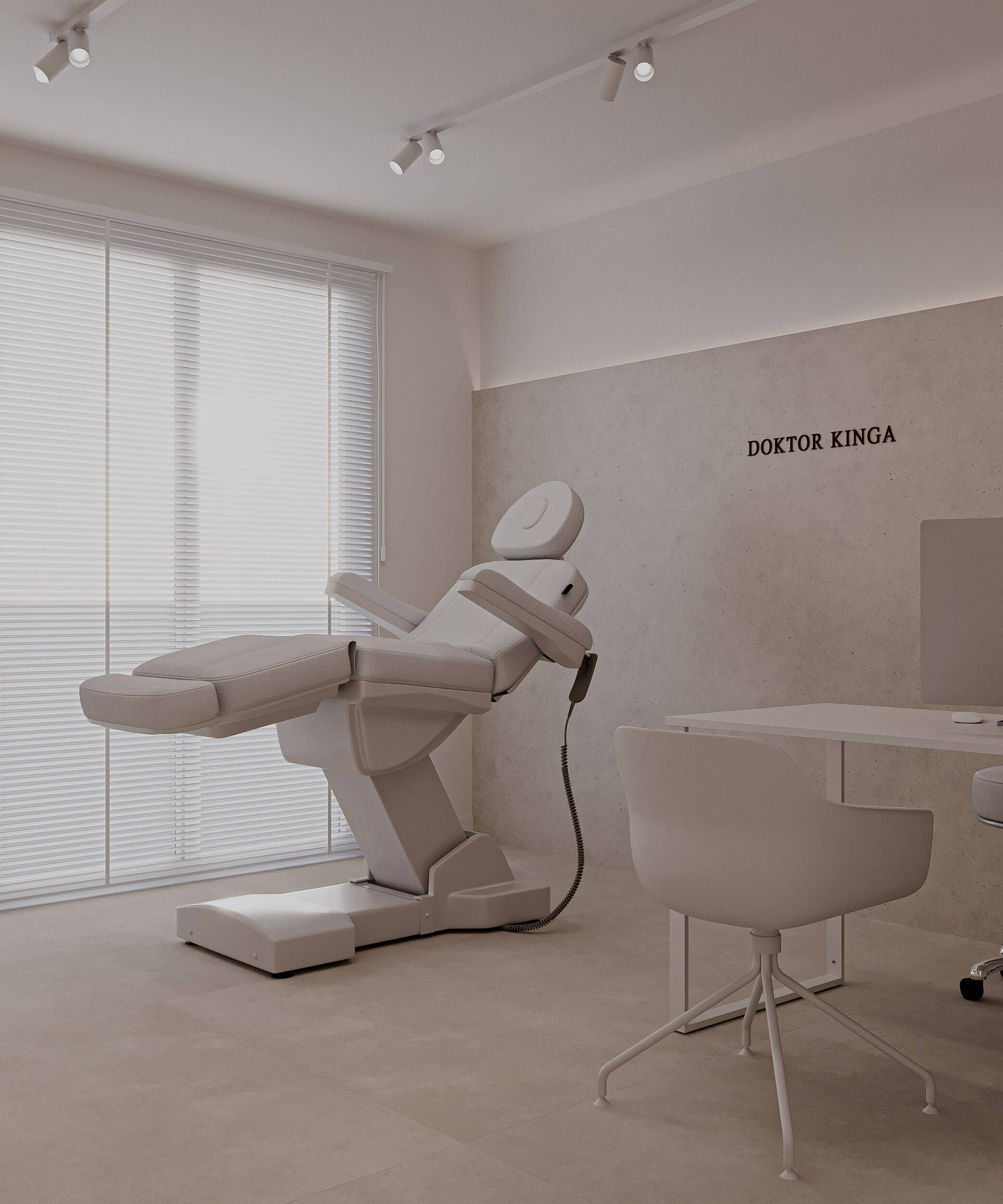 Kluczowym elementem gabinetu są zaawansowane technologicznie fotele zabiegowe, które zapewniają ergonomiczną pozycję pacjenta podczas iniekcji czy zabiegów aparaturowych, gwarantując pełen komfort nawet przy dłuższych sesjach. System oświetlenia został precyzyjnie podzielony na sekcje - techniczne reflektory szynowe dostarczają światło niezbędne do precyzyjnej pracy diagnostycznej, natomiast liniowe podświetlenia LED przy wielkoformatowych lustrach, czy wnękach dodają wnętrzu głębi i nowoczesnego sznytu. Całość kompozycji, dopełniona jest dyskretną zabudową medyczną i profesjonalnymi preparatami. Gabinet ten to elitarny charakter miejsca, w którym dbałość o detale estetyczne idzie w parze z medyczną doskonałością.
