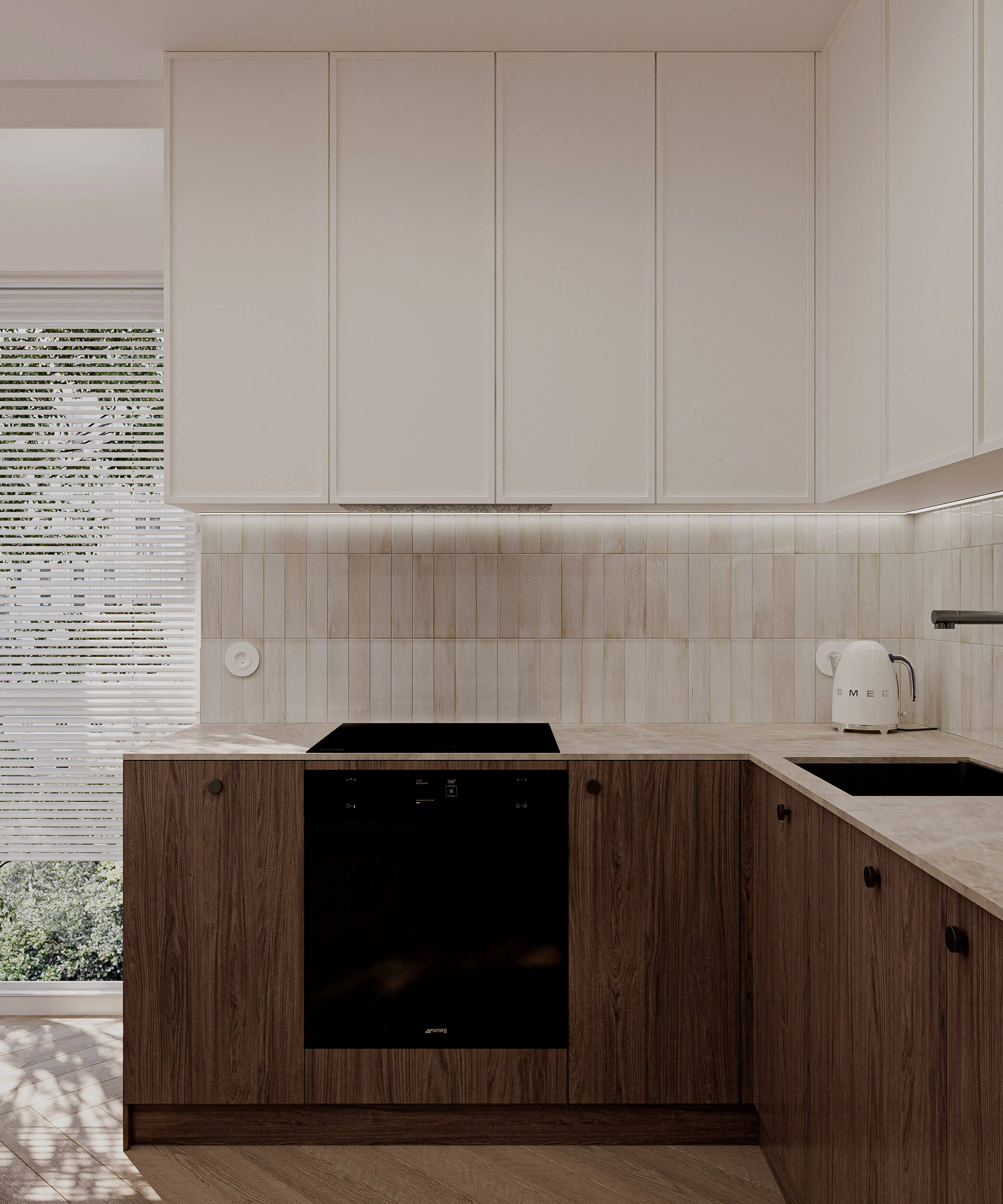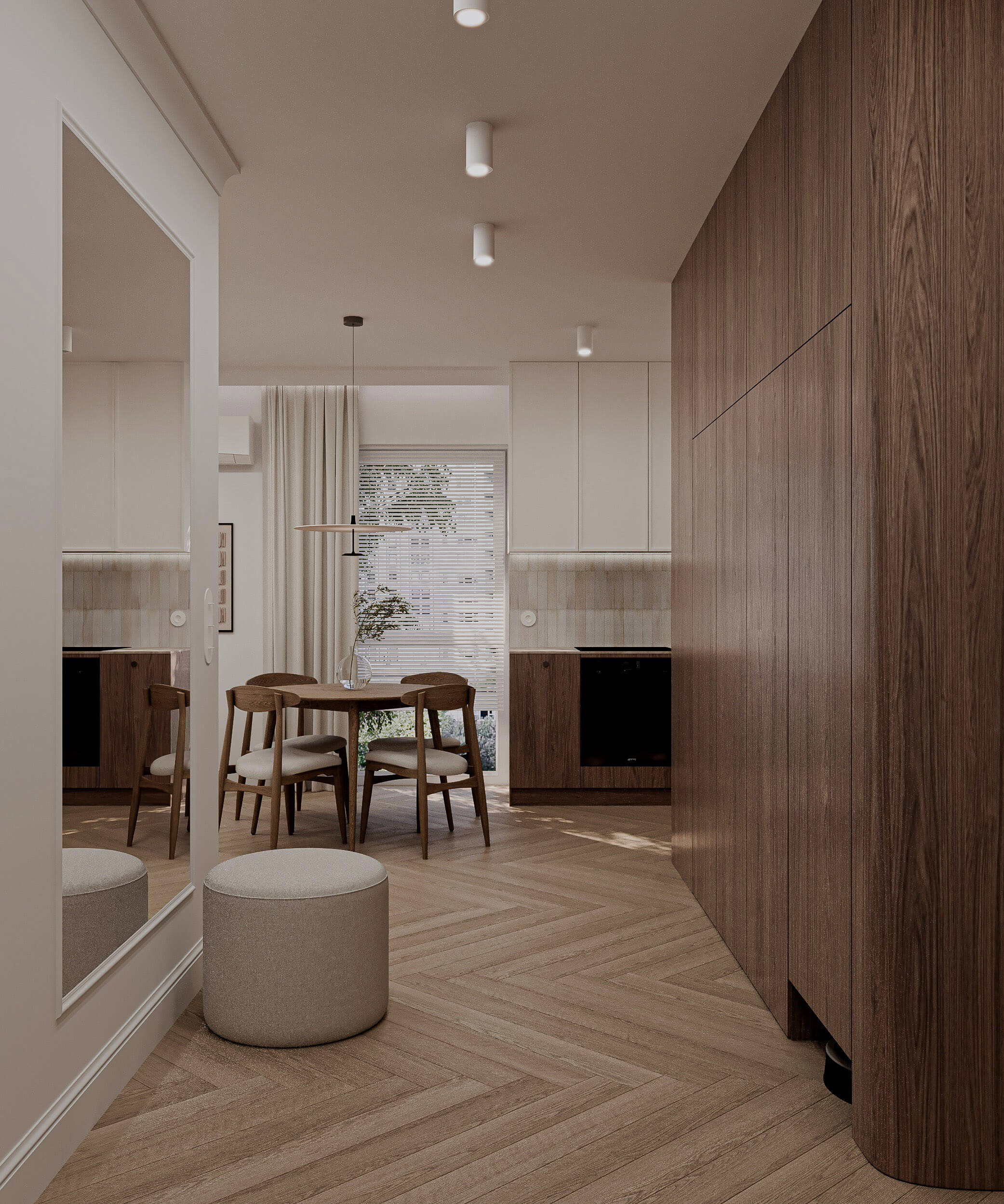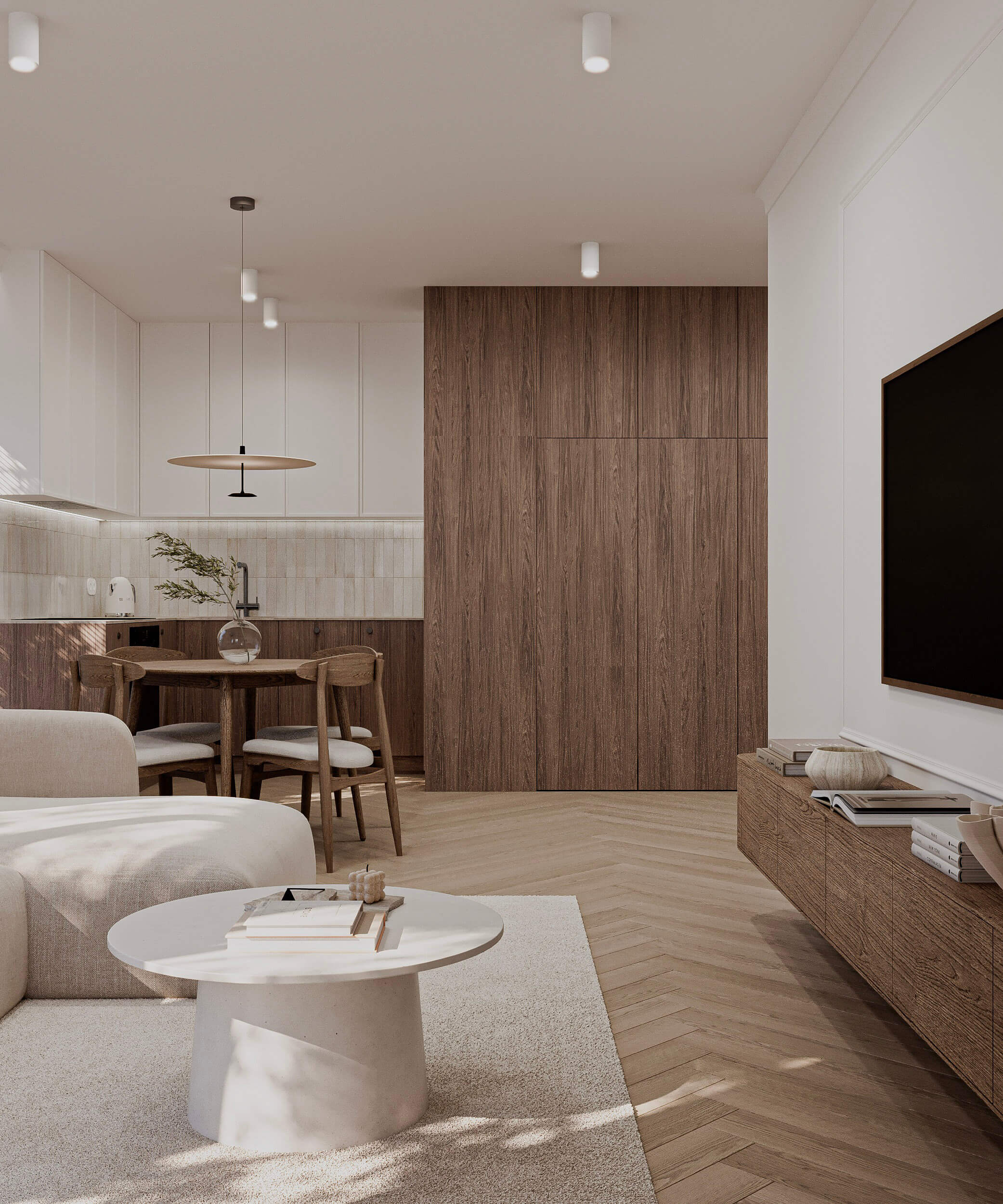 Projekt „Harmonia Japandi” to autorska interpretacja dialogu między skandynawską funkcjonalnością a japońską filozofią minimalizmu. Przestrzeń została zaprojektowana jako azyl spokoju, w którym każdy element architektoniczny i dekoracyjny służy budowaniu poczucia równowagi. Fundamentem koncepcji jest gra kontrastów - głębokiego, ciemnego usłojenia drewna z czystą, matową bielą oraz geometrycznego ładu zabudowy z organicznymi formami. Szczególną uwagę poświęcono detalom wykończenia: krawędzie i rogi mebli zostały delikatnie zaoblone, co nadaje bryłom lekkości, wprowadza wizualną miękkość i podnosi bezpieczeństwo użytkowania, wpisując się w nurt przyjaznego, opływowego designu.