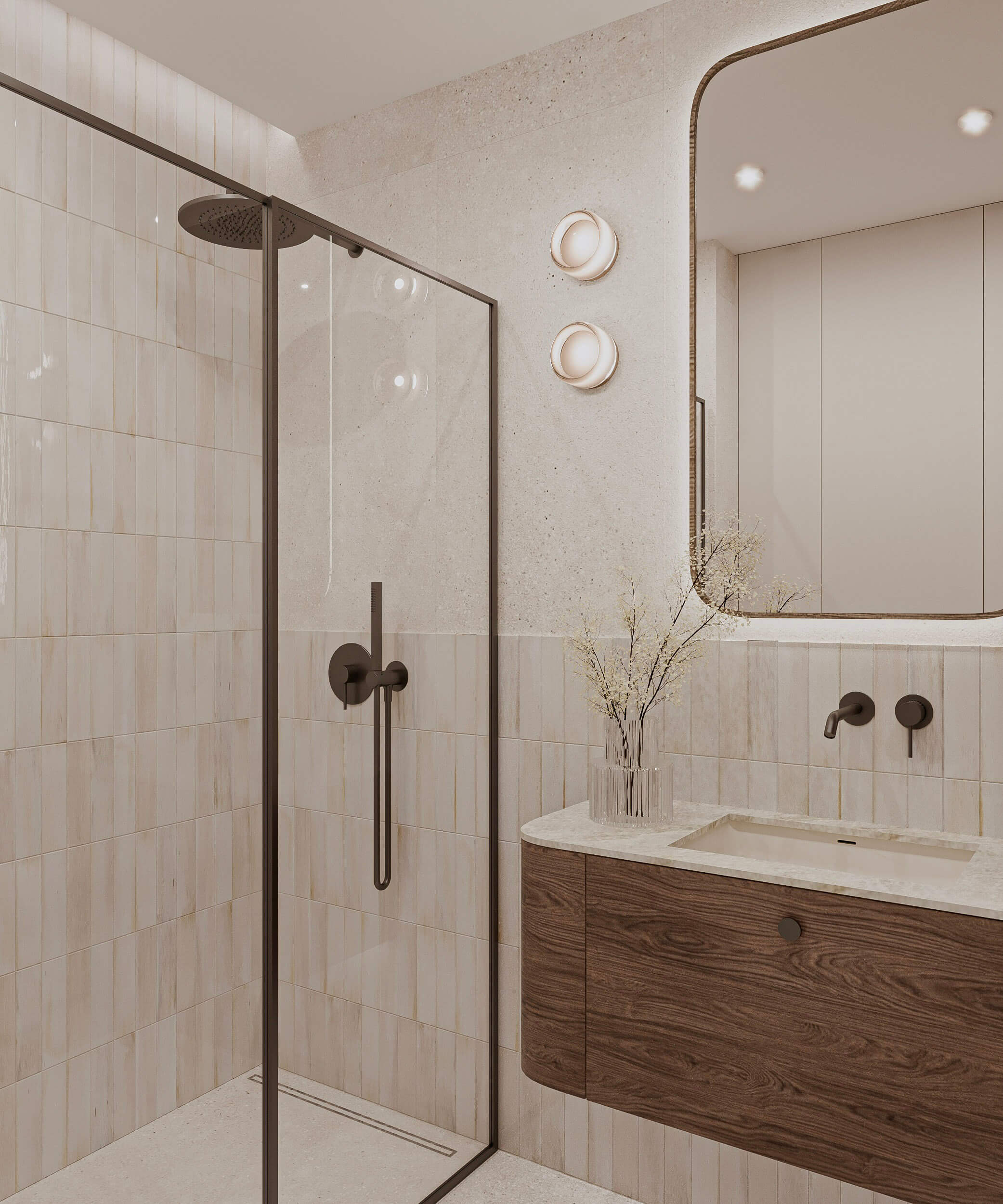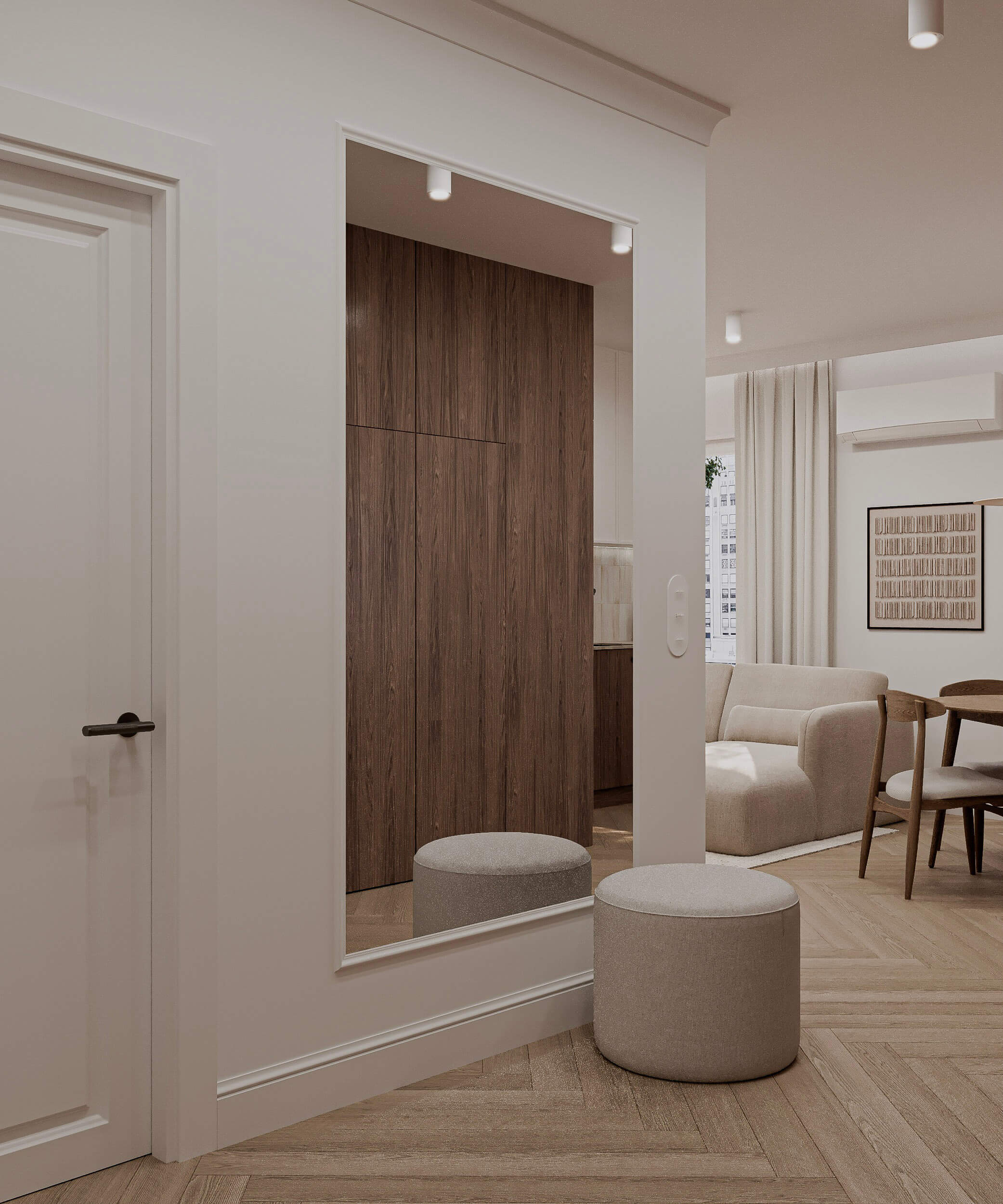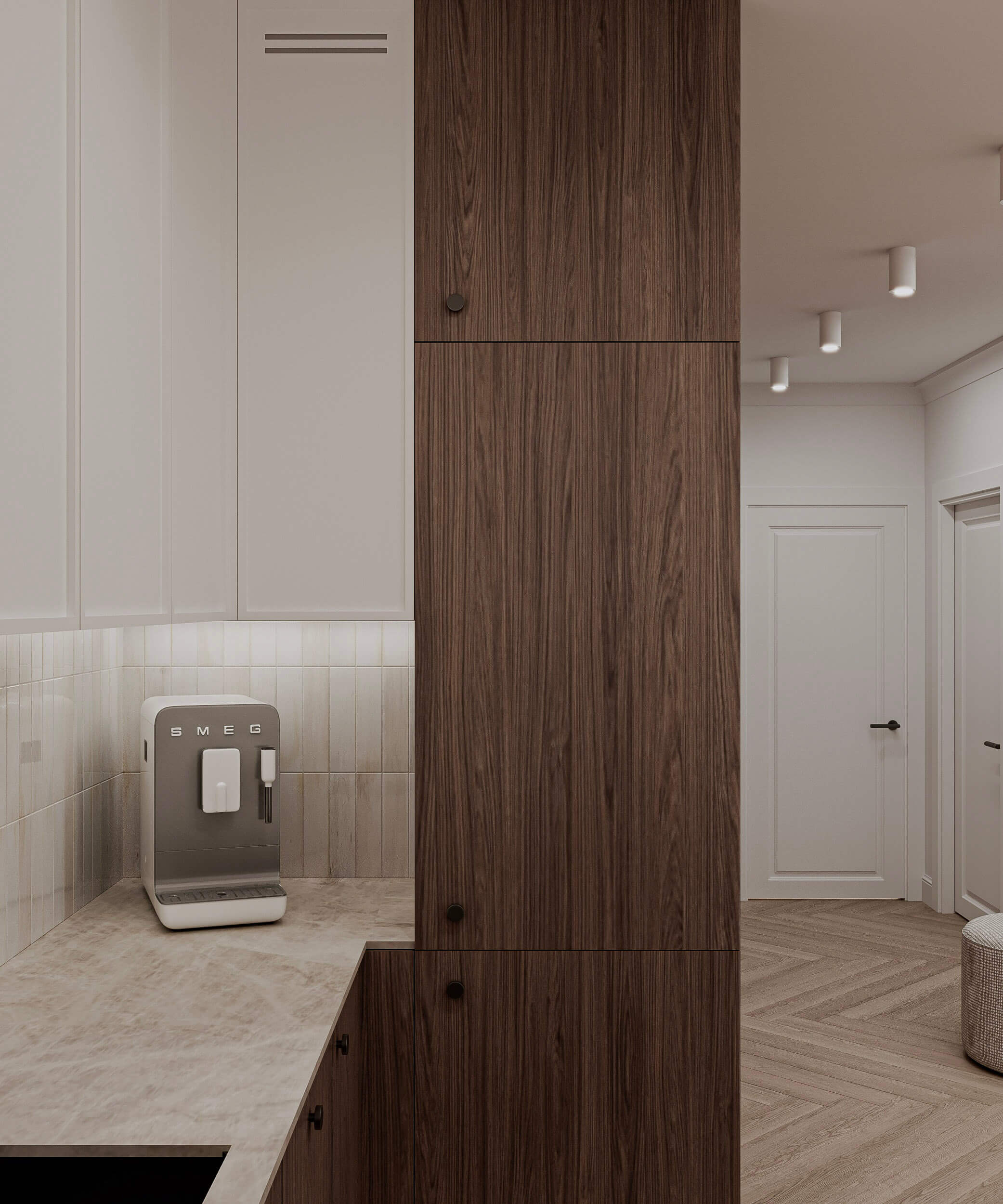 Projekt „Harmonia Japandi” to autorska interpretacja dialogu między skandynawską funkcjonalnością a japońską filozofią minimalizmu. Przestrzeń została zaprojektowana jako azyl spokoju, w którym każdy element architektoniczny i dekoracyjny służy budowaniu poczucia równowagi. Fundamentem koncepcji jest gra kontrastów - głębokiego, ciemnego usłojenia drewna z czystą, matową bielą oraz geometrycznego ładu zabudowy z organicznymi formami. Szczególną uwagę poświęcono detalom wykończenia: krawędzie i rogi mebli zostały delikatnie zaoblone, co nadaje bryłom lekkości, wprowadza wizualną miękkość i podnosi bezpieczeństwo użytkowania, wpisując się w nurt przyjaznego, opływowego designu.