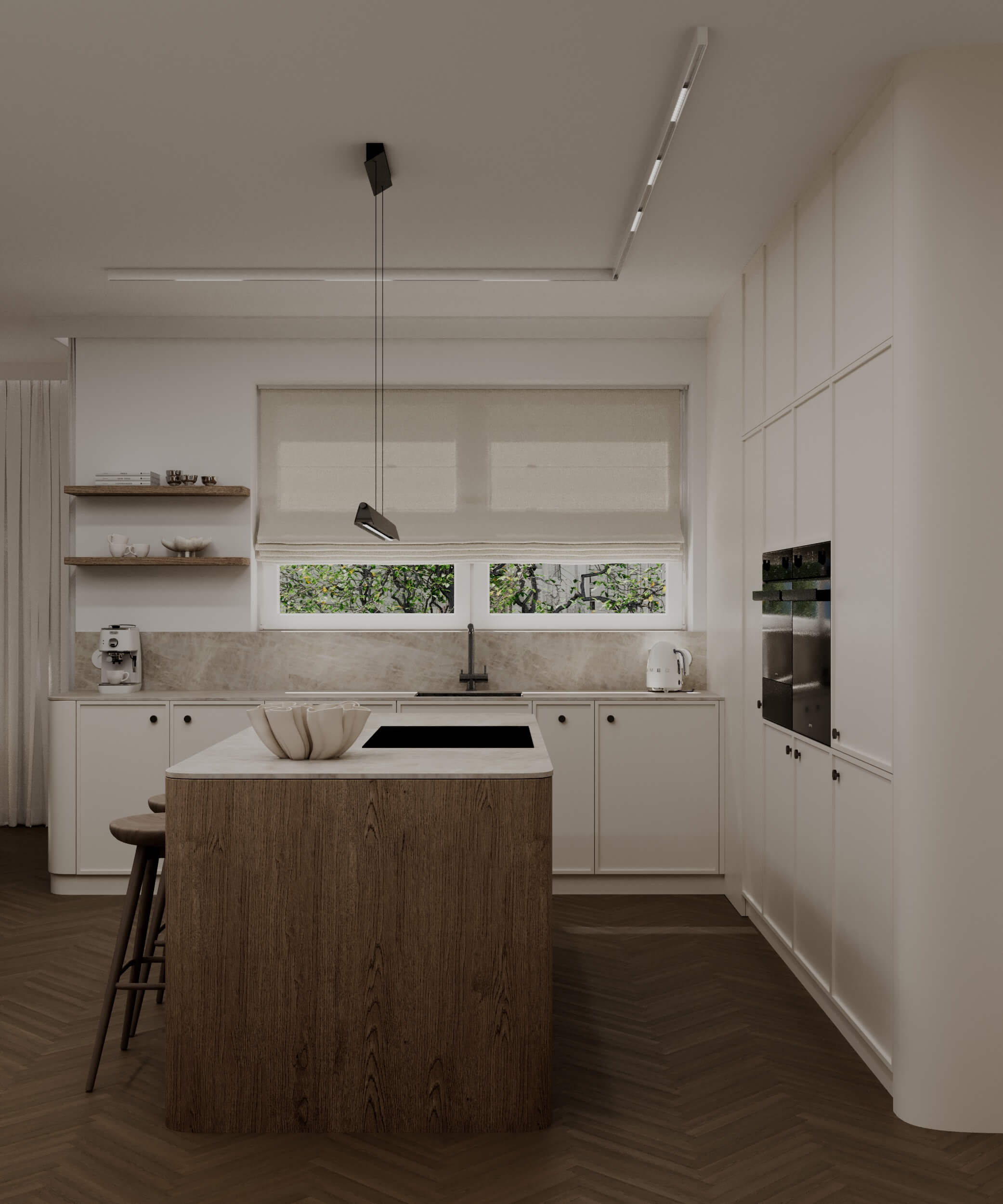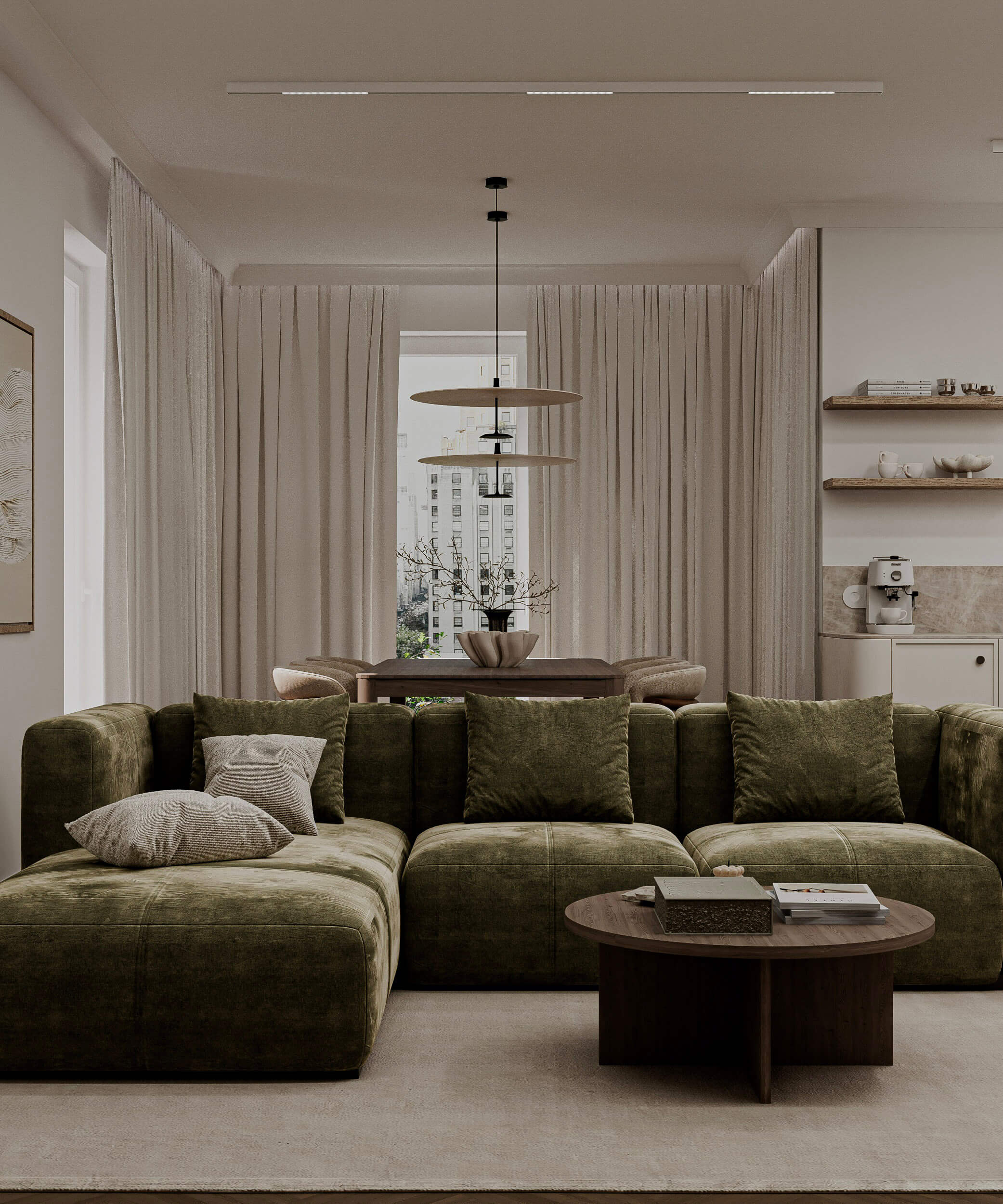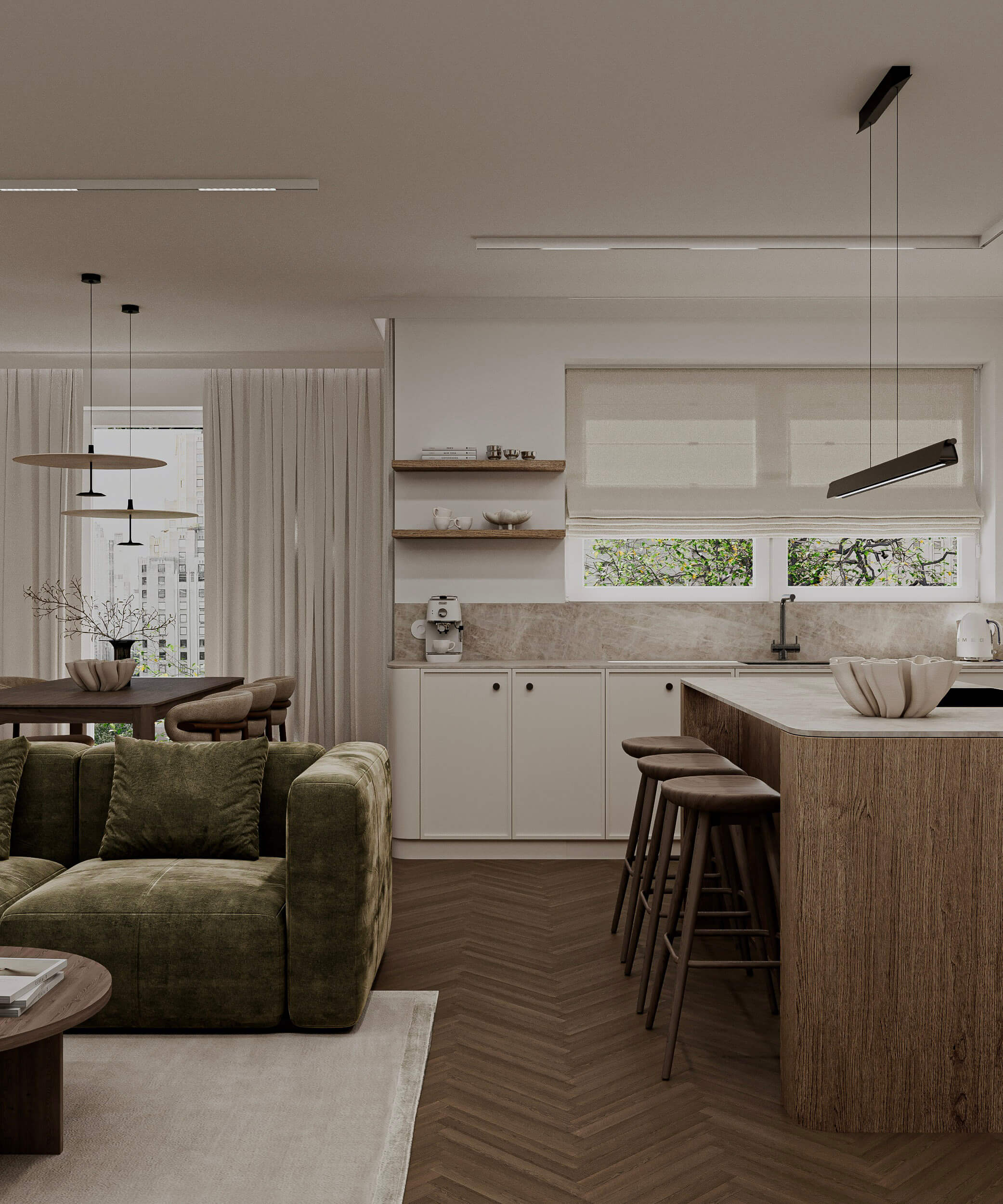 Projekt opiera się na idei subtelnej, ponadczasowej elegancji zakorzenionej w naturze. Kluczową rolę odgrywają tu stonowane barwy inspirowane ziemią - ciepłe beże, kremy, oliwkowe zielenie oraz głębokie odcienie drewna. Ta spokojna paleta kolorystyczna tworzy harmonijną całość, która sprzyja wyciszeniu i codziennemu komfortowi.