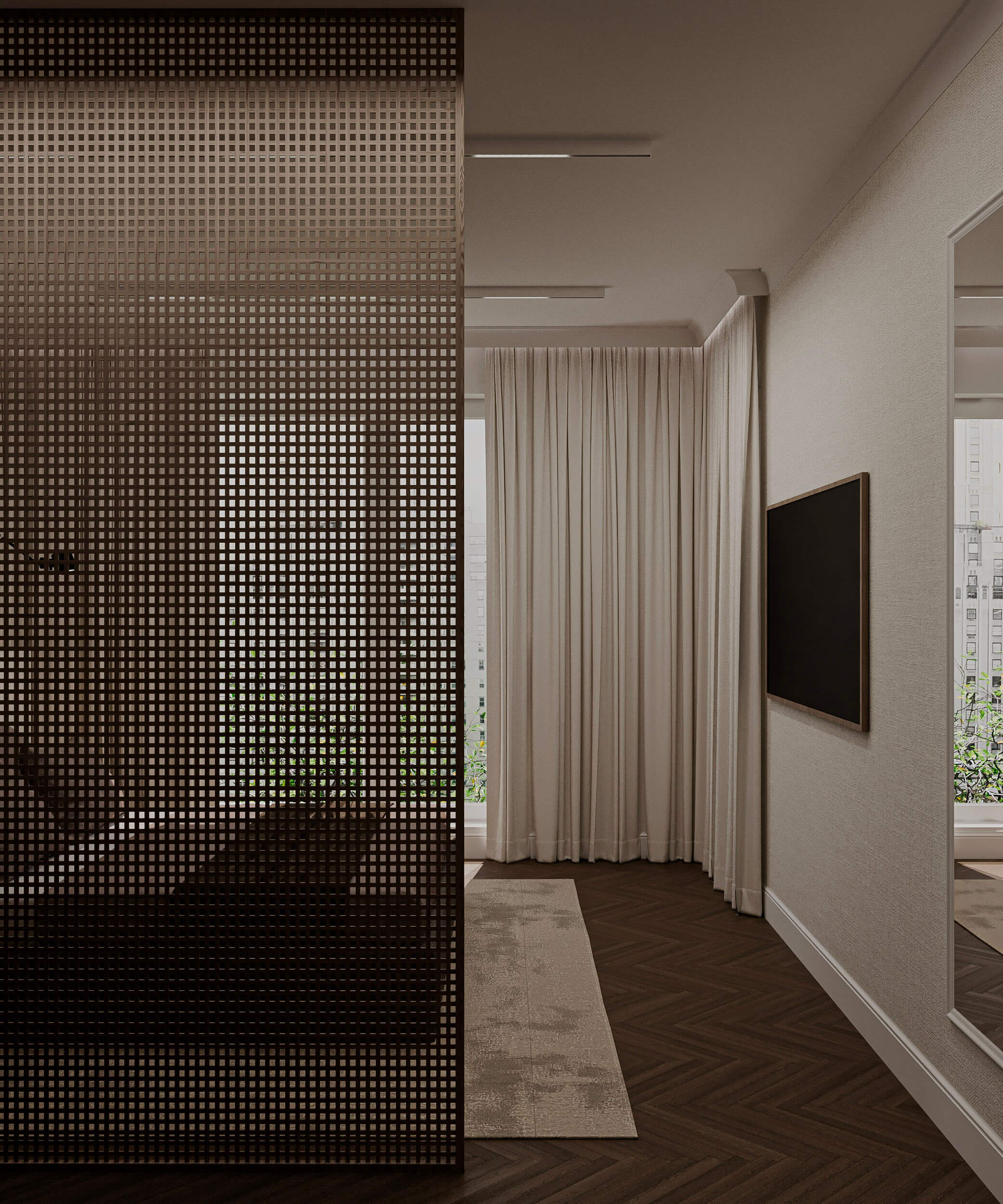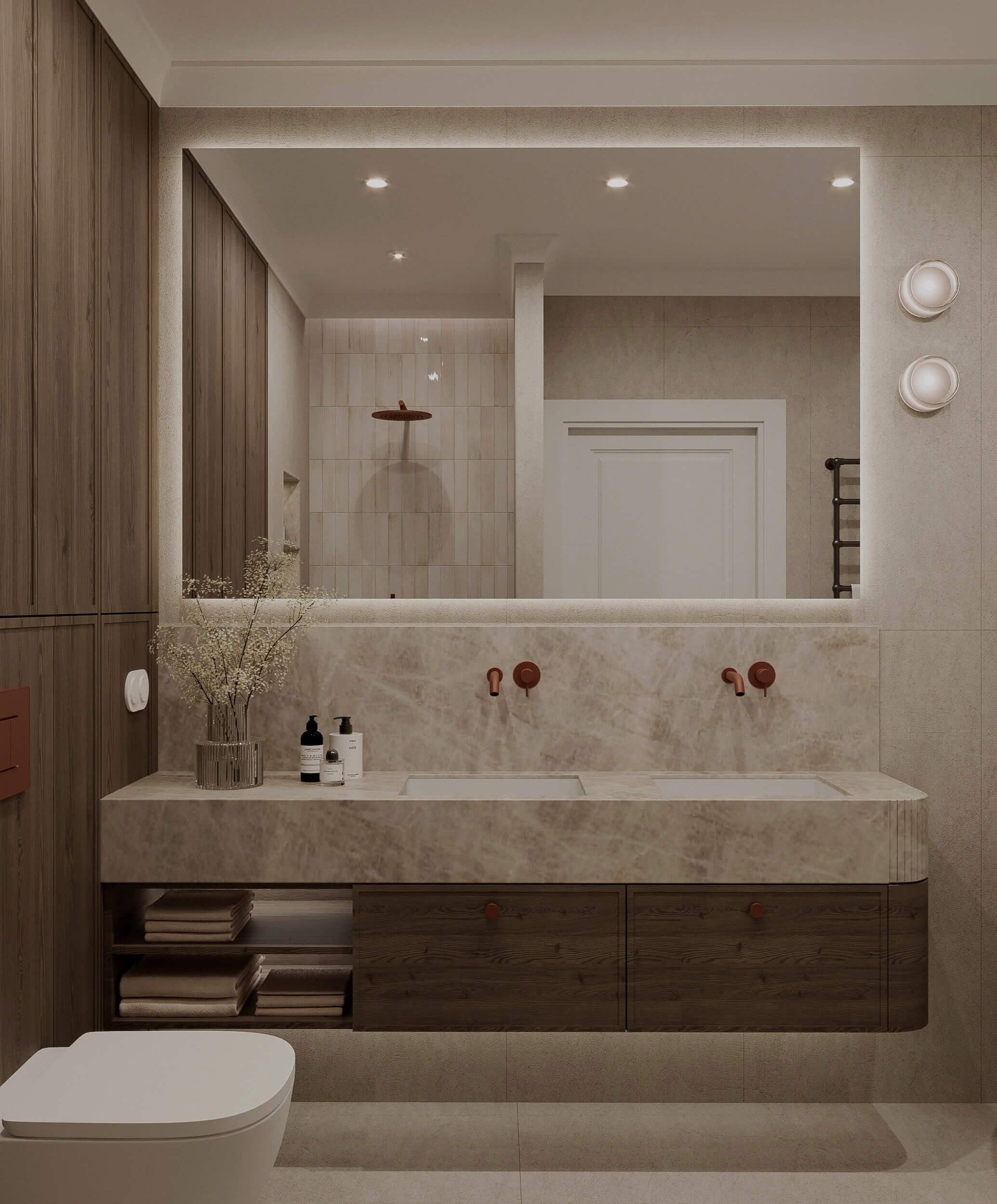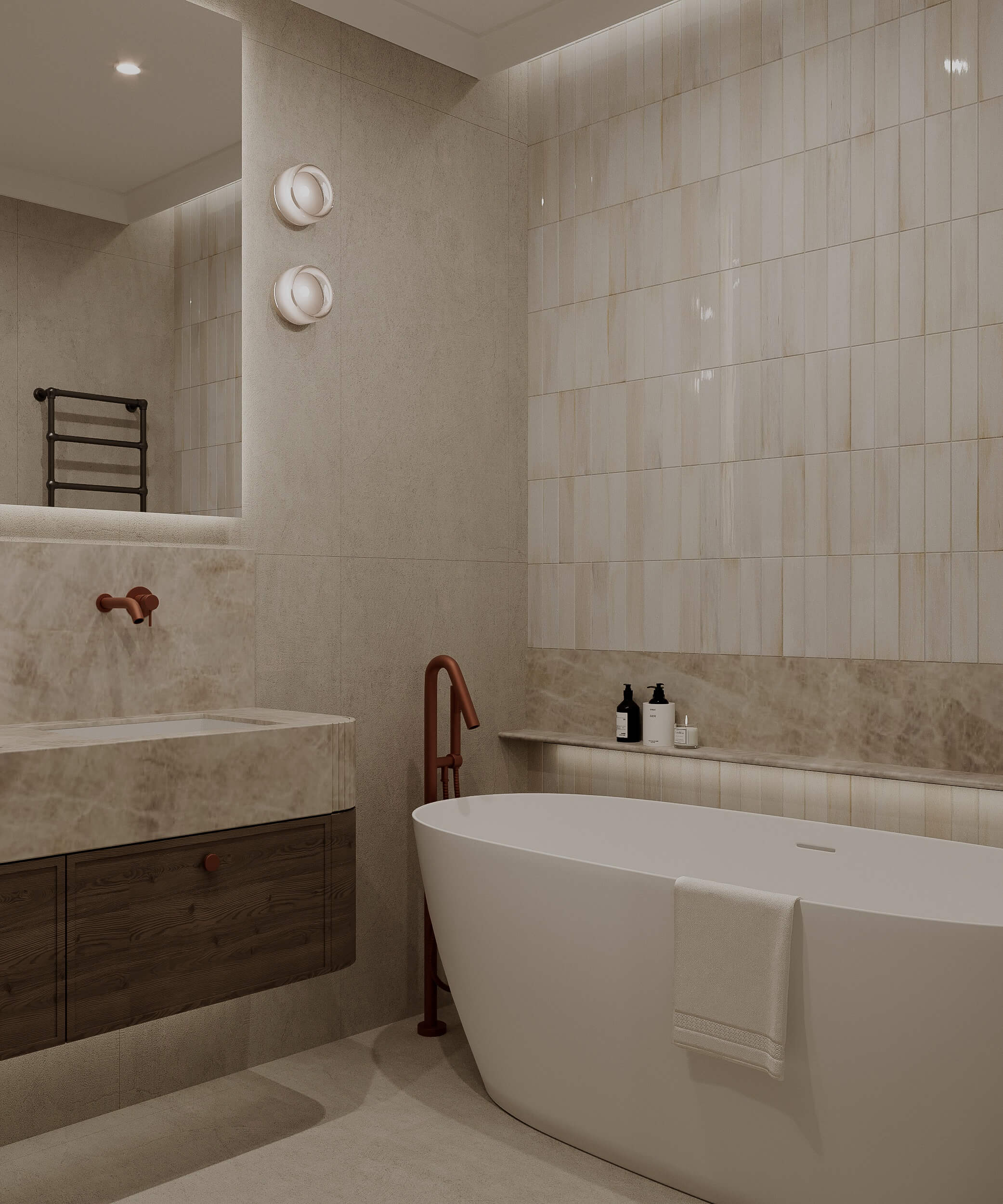 Projekt opiera się na idei subtelnej, ponadczasowej elegancji zakorzenionej w naturze. Kluczową rolę odgrywają tu stonowane barwy inspirowane ziemią - ciepłe beże, kremy, oliwkowe zielenie oraz głębokie odcienie drewna. Ta spokojna paleta kolorystyczna tworzy harmonijną całość, która sprzyja wyciszeniu i codziennemu komfortowi.