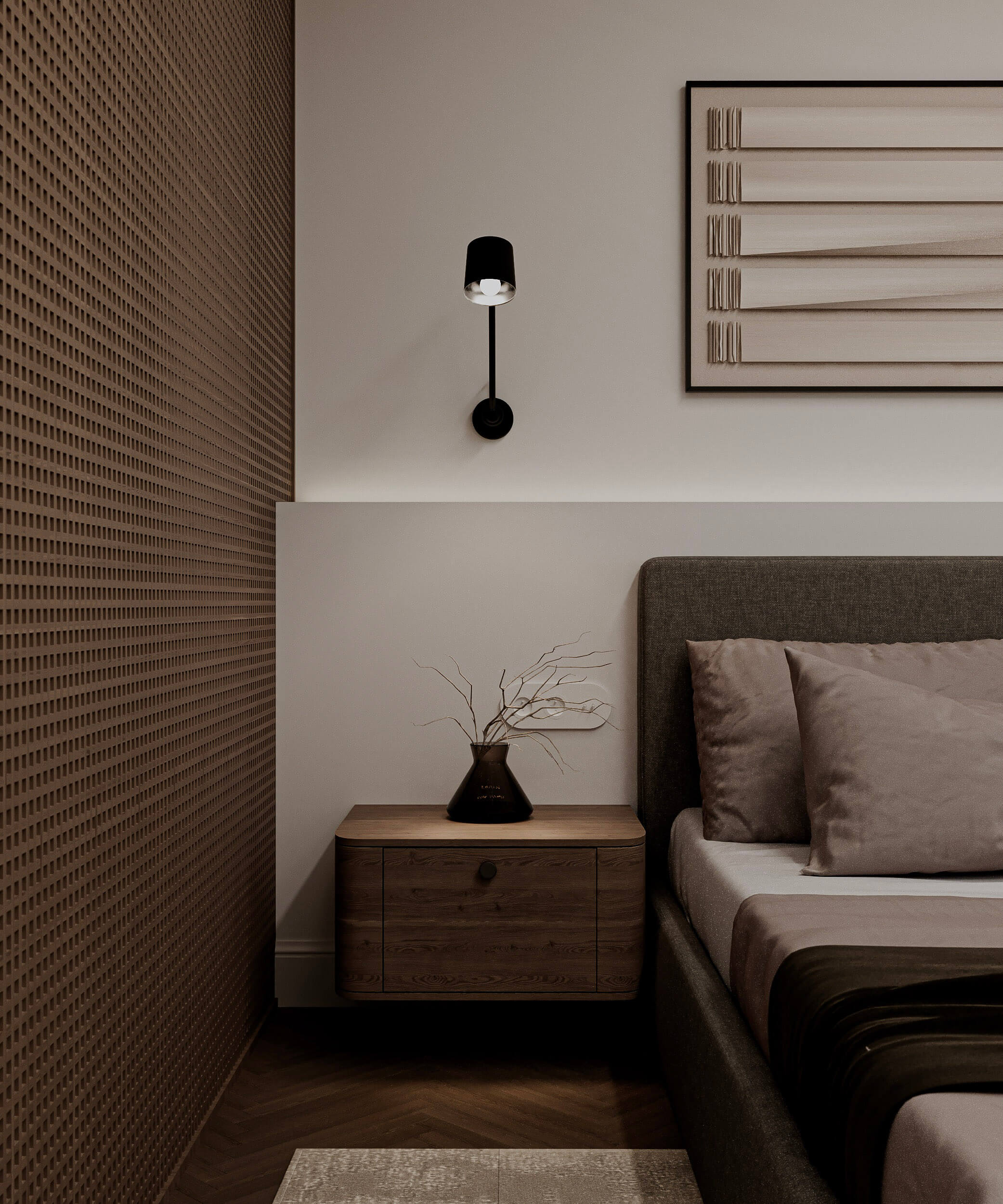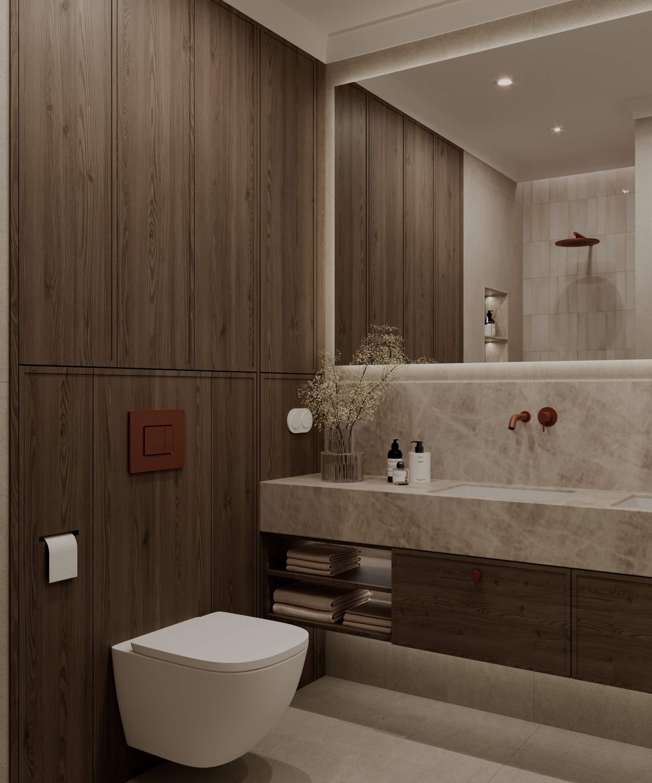 W aranżacji dominują naturalne materiały i wyraźne, autentyczne faktury. Drewno o widocznym rysunku słojów, miękkie tkaniny oraz kamienne powierzchnie budują poczucie szlachetności i trwałości. Zestawione ze sobą w prostych, minimalistycznych formach nadają przestrzeni elegancki, ale jednocześnie bardzo przyjazny i domowy charakter.