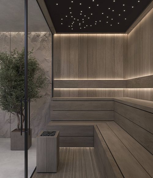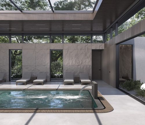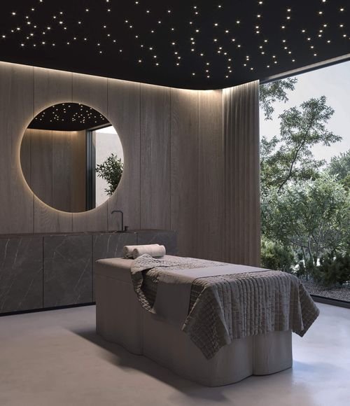Harmonię wnętrza dopełnia nowoczesna, przeszklona sauna oraz kameralne gabinety masażu, oferujące profesjonalne terapie w duchu absolutnego spokoju. Szerokie otwarcie na wewnętrzne patio sprawia, że bujna roślinność staje się integralnym elementem wystroju, wpływając kojąco na zmysły o każdej porze roku. Minimalistyczne leżanki oraz subtelne oświetlenie ogrodowe podkreślają luksusowy, a zarazem organiczny charakter miejsca, w którym architektura służy pełnej regeneracji ciała i umysłu.