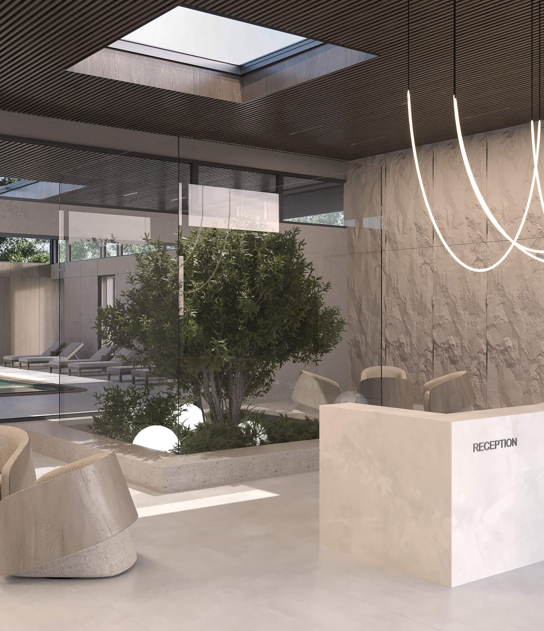 Projekt strefy wellness „Spa w rytmie natury” to unikalna koncepcja architektoniczna, w której granica między wnętrzem a krajobrazem niemal całkowicie zanika. Przestrzeń zaprojektowano jako azyl wyciszenia, wykorzystujący szlachetne drewno i naturalne światło do budowania atmosfery głębokiego relaksu. Centralnym punktem jest basen z kojącą kaskadą wodną umieszczone pod efektownym przeszkleniem dachowym, które otwiera widok na korony drzew i niebo.